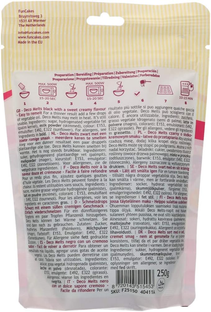 Donnez un superbe effet dégoulinant à votre gâteau ou sublimez vos sucettes et chocolats, grâce aux pistoles Deco Melts de FunCakes. Vous pouvez également les utiliser pour enrober vos biscuits, fruits, ou cake pops, et pour décorer vos douceurs. Ces pistoles noires ont un délicieux goût crémeux de chocolat blanc.