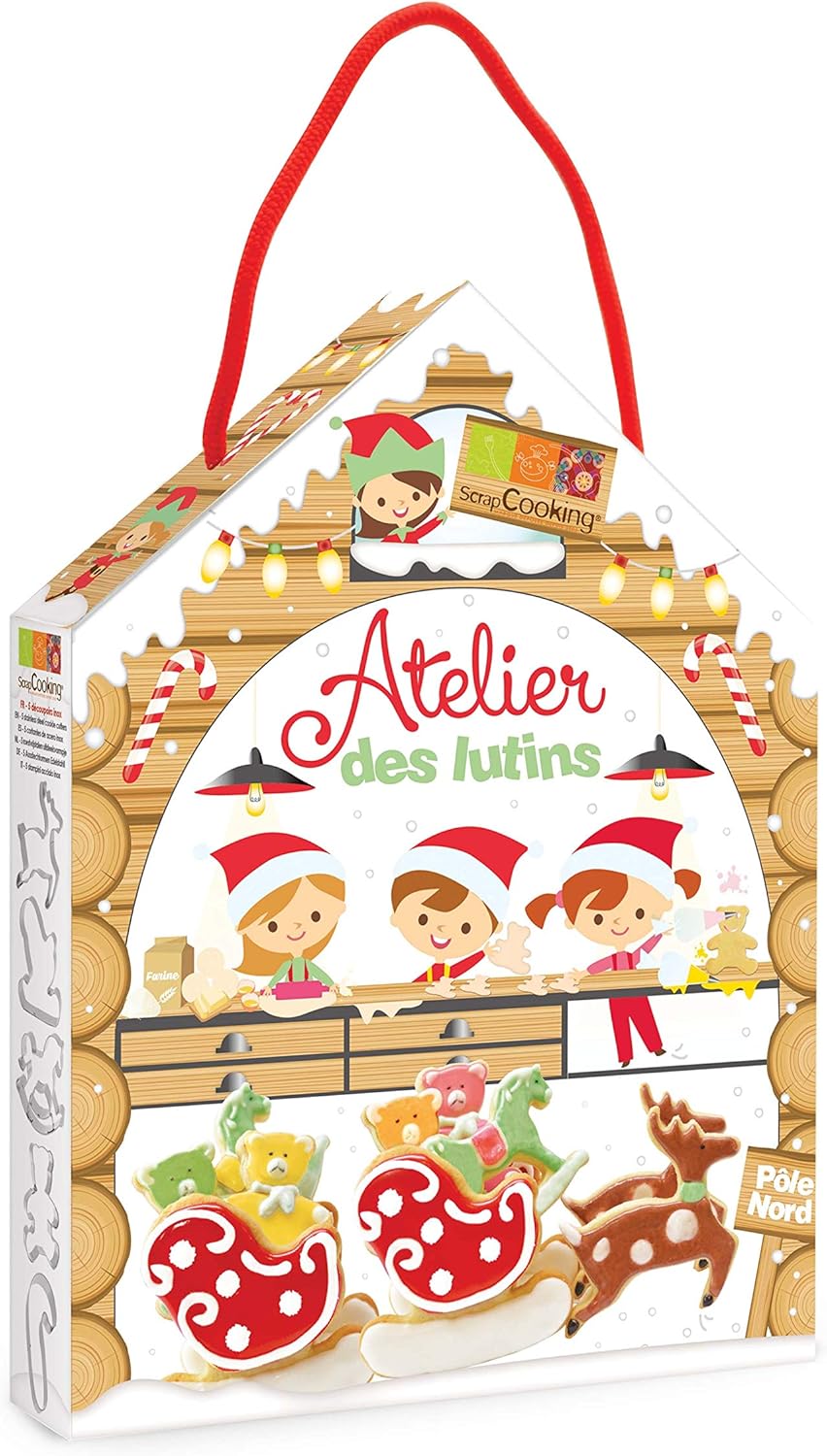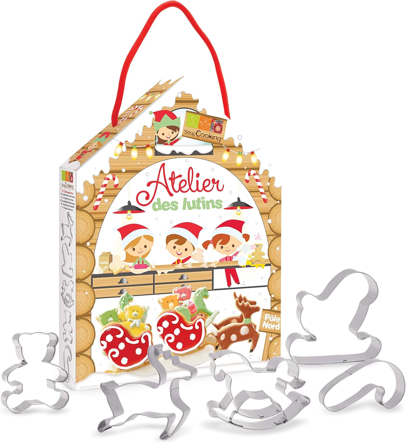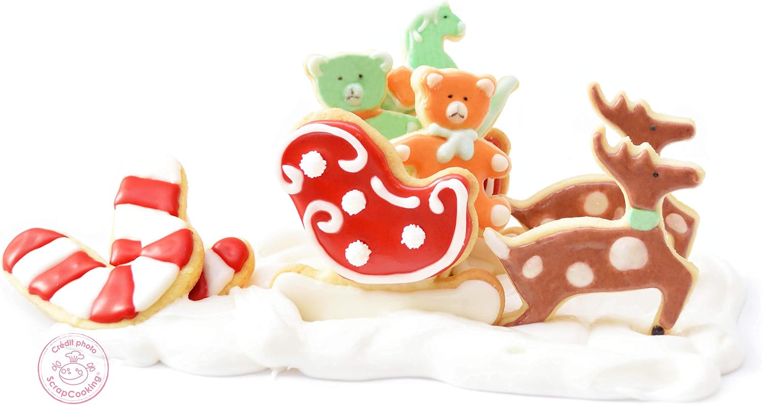 Kit de 5 découpoirs en inox ( un cheval à bascule, un traineau, un renne, une canne à sucre et un ourson) pour réaliser le traineau du père noël. Présenté dans une jolie boîte en forme de maison, ce kit est parfait pour animer les vacances de Noël avec vos enfants.