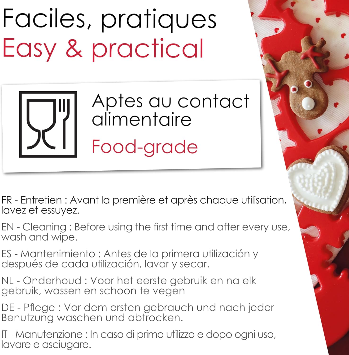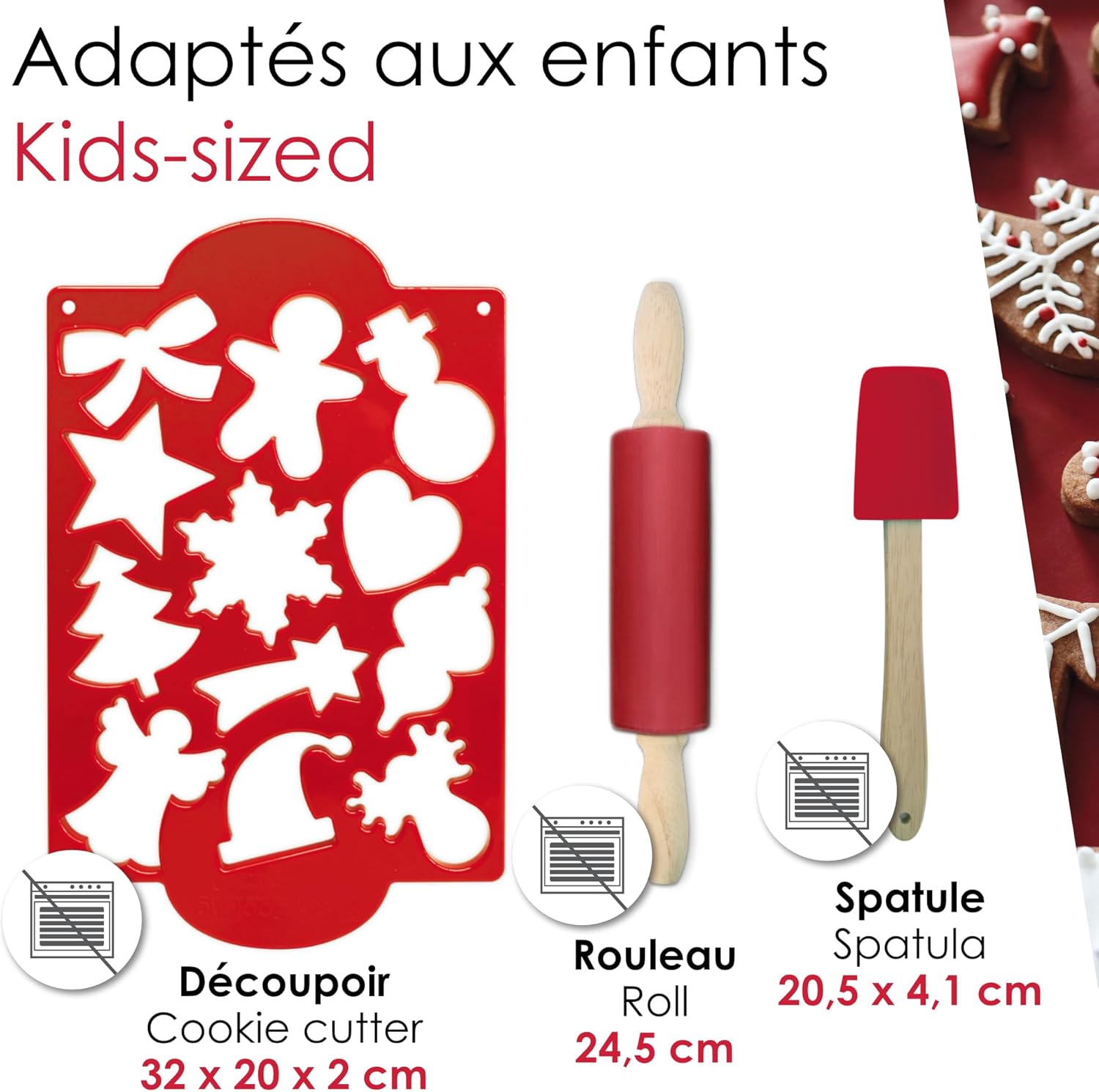 - 🍪 PRATIQUES & LUDIQUES – Ce coffret contient 3 ustensiles : une spatule et un rouleau en bois et silicone, ainsi qu’une plaque emporte-pièce en plastique ABS qui permettra de former 12 biscuits aux formes variées (étoile, sapin, tête de renne, bonhomme de neige…) en 1 tour de main. Ne passent pas au lave-vaisselle, ni au four. Se lavent facilement à la main. Coloris : rouge.