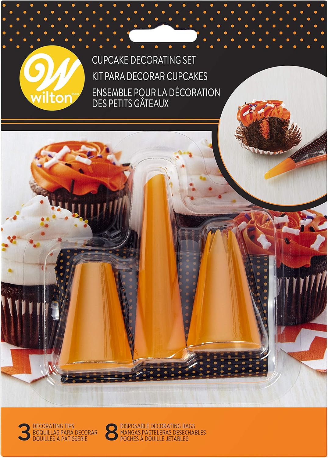 Surprenez votre famille et vos amis avec des cupcakes d’Halloween faits maison ! Cet ensemble de chez Wilton contient tout ce qu’il faut pour vous lancer dans la décoration à base de glaçage et de crème au beurre. Il comprend 3 douilles pâtissières de décoration en plastique orange et 8 poches à douille jetables avec des pointillés.
