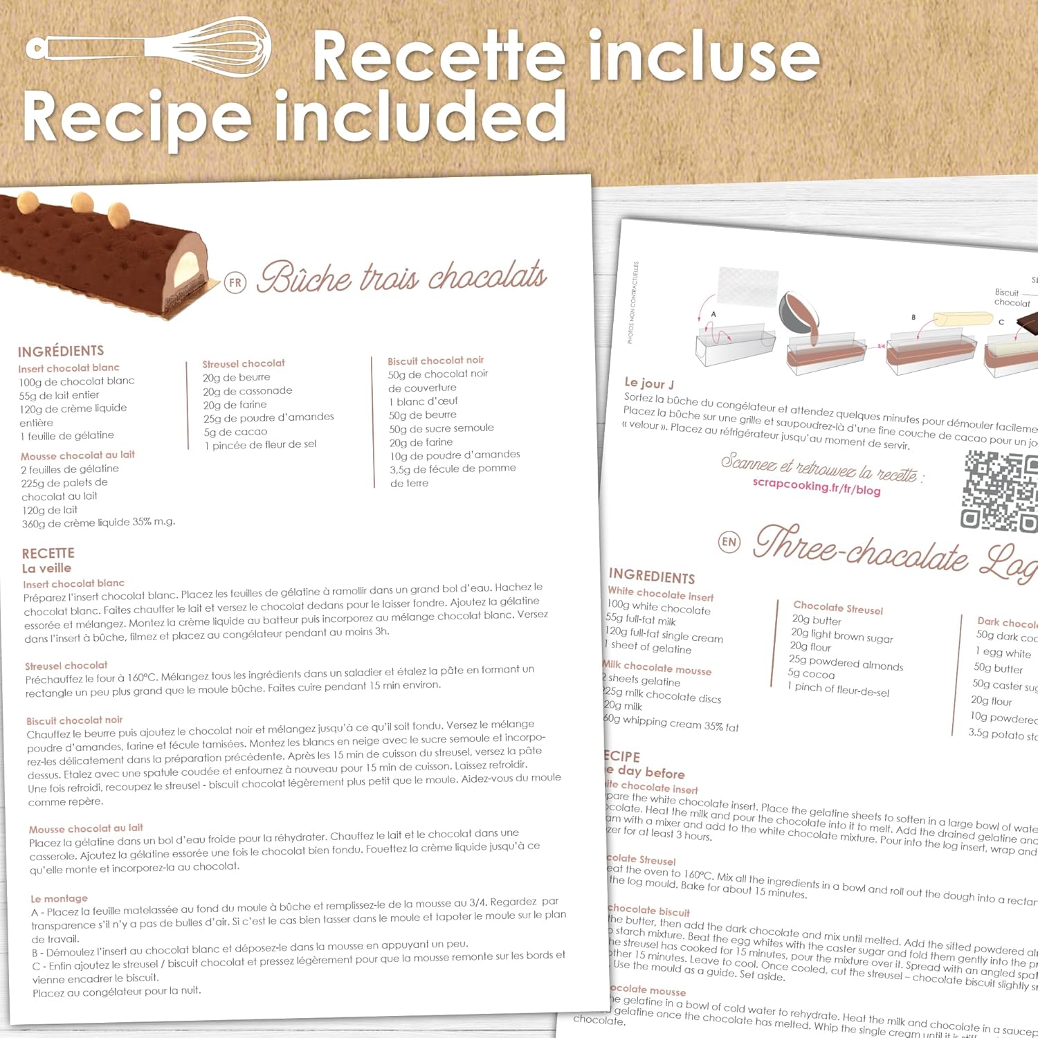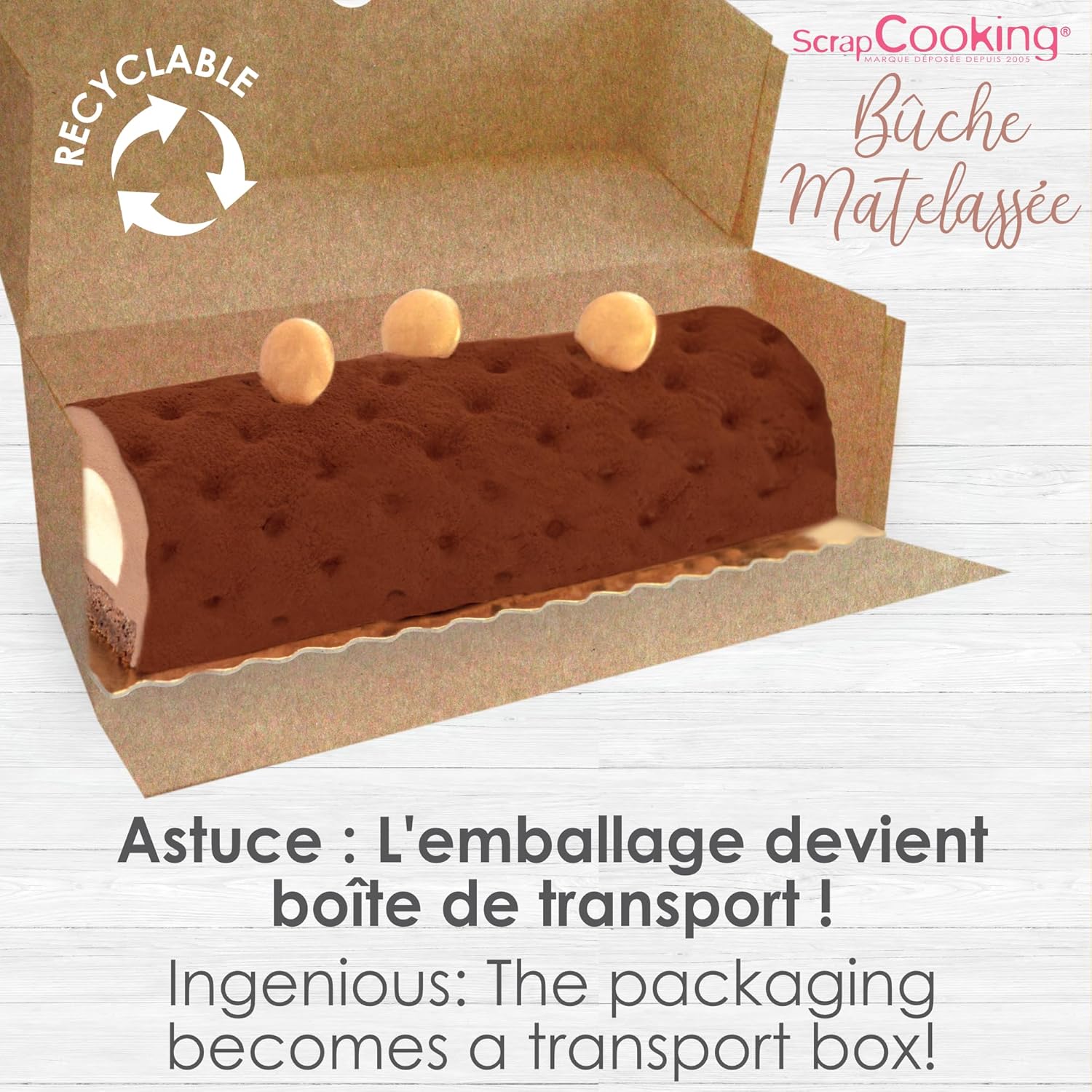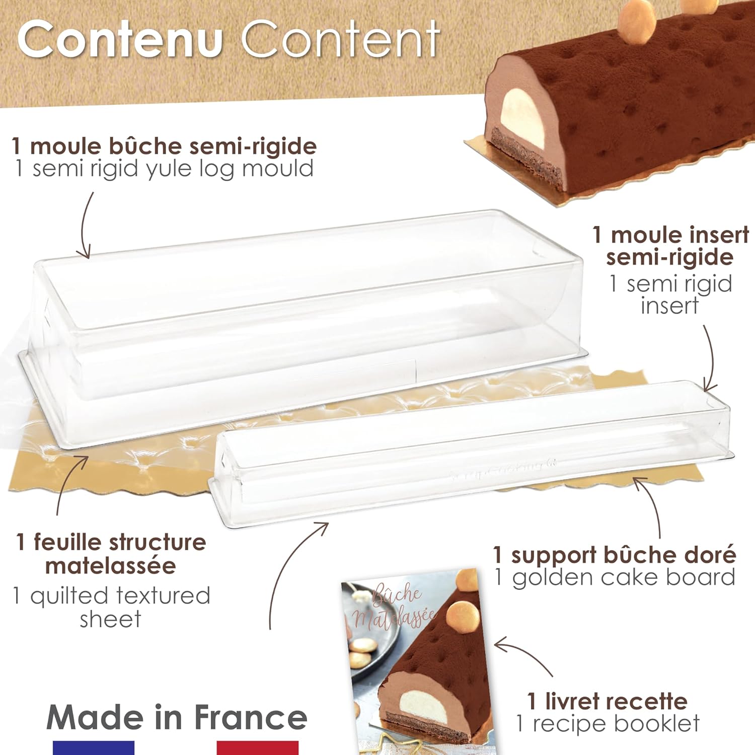 Retrouvez dans ce kit tout le nécessaire pour réaliser une bûche matelassée comme chez le pâtissier: 1 moule bûche semi-rigide, 1 insert bûche semi-rigide, 1 feuille structure matelassée et 2 supports dorés. Brillez devant vos convives lors des fêtes de fin d’année !